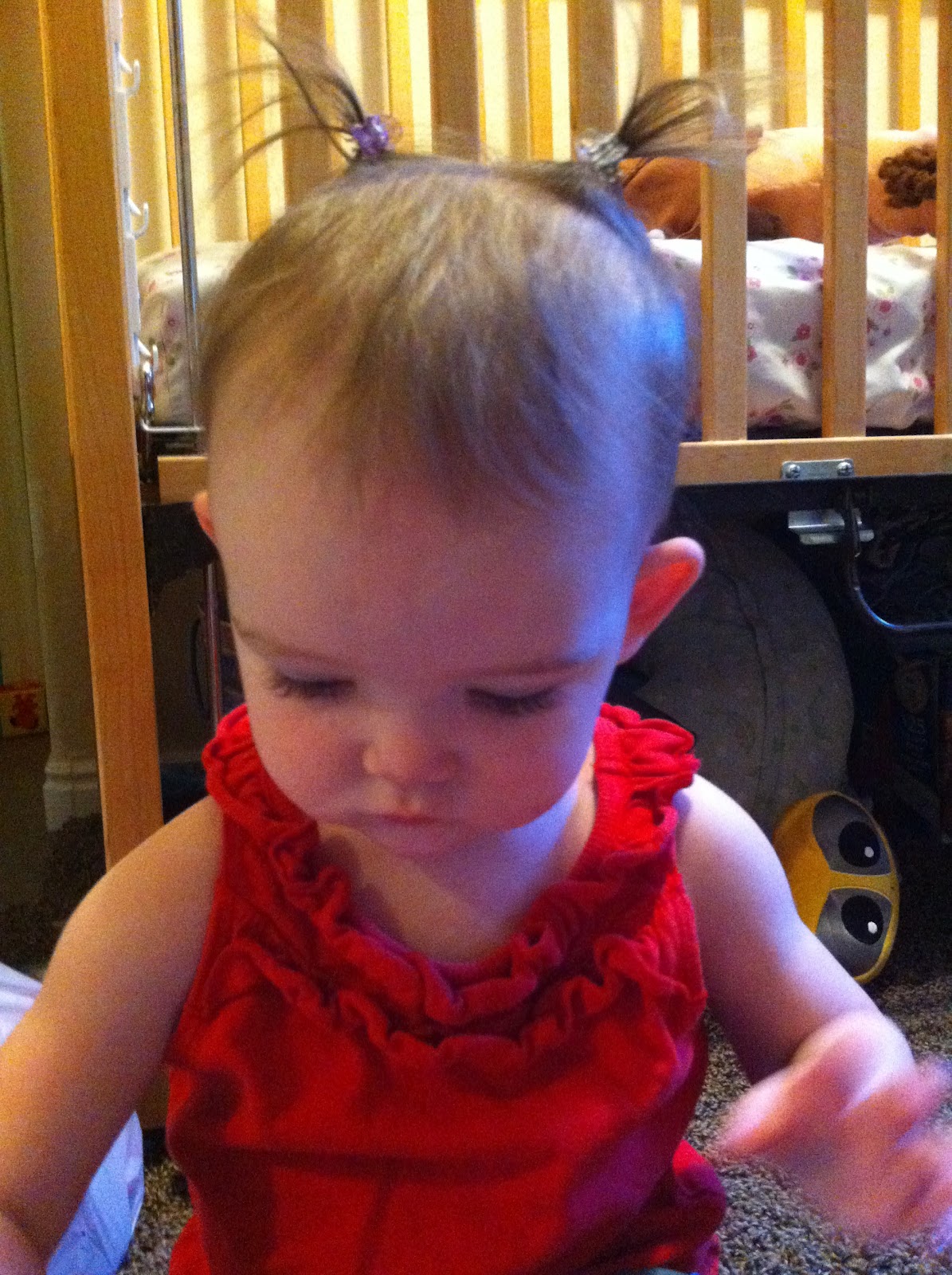 She also went to her first week at nursery! HALLELUJAH! I've been looking foreword to that moment for the last 6 months! I dropped her off and the nursery teacher said "you may want to come get her after 5 or 10 minutes to get her used to it". Pffsssh! As soon as I dropped her off, I knew she would be fine for the whole 2 hours. She walked to the middle of the room, did a slow turn with a huge grin on her face, then looked at me and yelled "Bye!" and was off playing. It was like she had just walked into wonderland! I did come check on her after the first hour. They had closed the door and I looked though the little eye hole into the room and she was standing over a boy with a big lego in her hand. I knew just what she was thinking, but I was too late to stop her. She smacked the boy in the head with the lego! He looked up at her confused, then went back to playing. Savannah looked confused at the lego in her hand, then tossed it aside and continued to play with the boy. Oh well, no harm, no foul right? The nursery teacher said she was surprised at how well she did her first time at nursery. I told her I knew she would be fine because we walk past it every Sunday and Savannah knew that there were other kids, snacks and lots of new toys in there. She would cry every time we passed it and I wouldn't let her go in. And can I just say, church is so much nicer when you aren't sitting in the hallway with a wild toddler for the entire 3 hours?